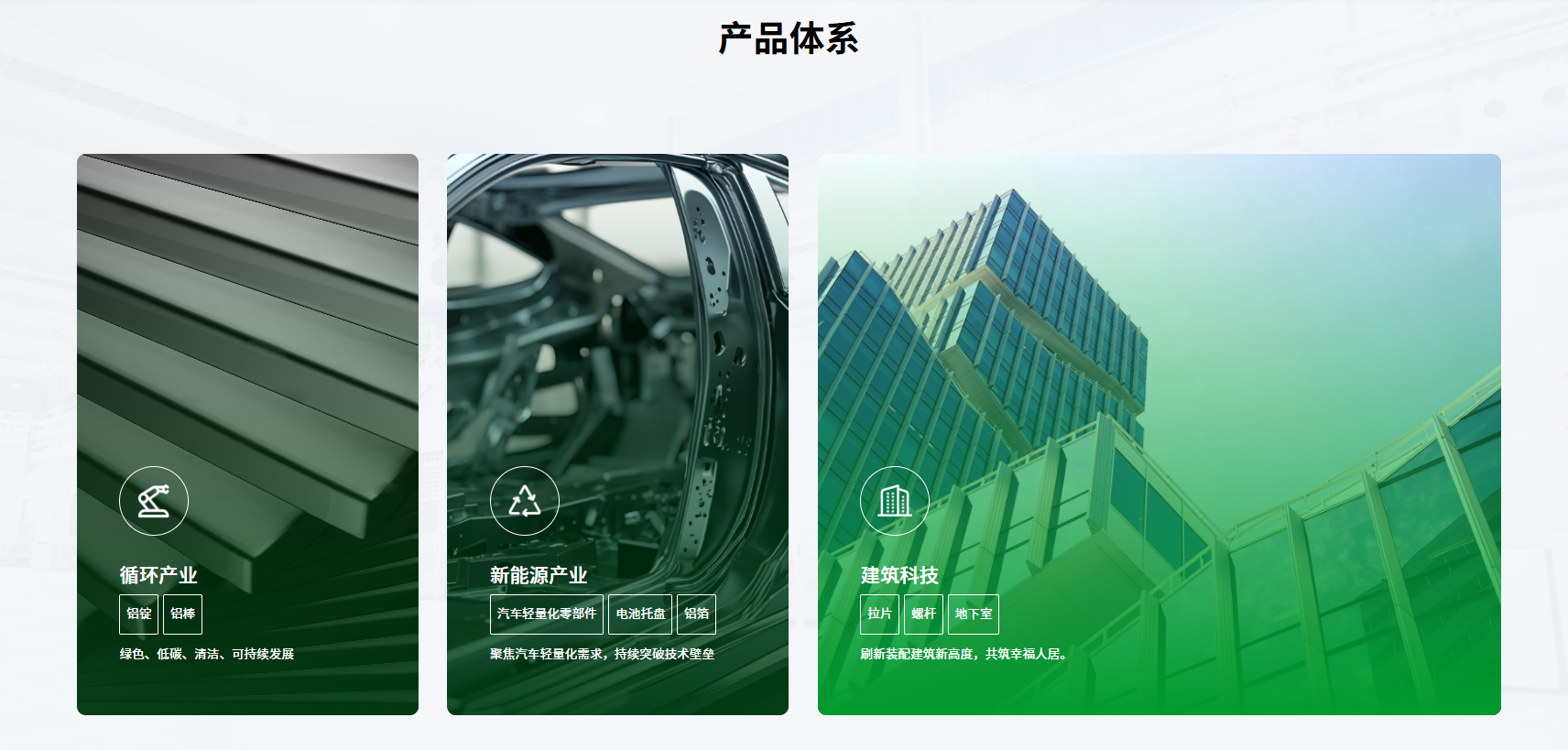官網(wǎng)系統(tǒng)性重構(gòu)產(chǎn)品展示體系,清晰呈現(xiàn)循環(huán)產(chǎn)業(yè)、新能源產(chǎn)業(yè)、建筑科技三大核心業(yè)務(wù)版圖,以精煉內(nèi)容與層次化視覺設(shè)計(jì),突顯鑫政從建筑科技向新能源材料領(lǐng)域的戰(zhàn)略延伸。